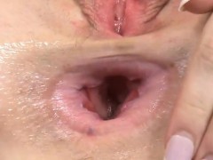 Gaping babe toying her asshole and pussy